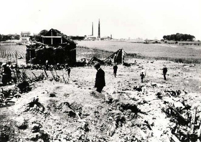 The following photographs, looking west, were taken on 19 June 1944. The aircraft crashed into the house, just east of the station, and tore off the roof. Refugees from Le Havre were living there, but nobody inside was killed. Behind to the left is the station, and to the right the brickworks. The village is a kilometre or so further to the west.